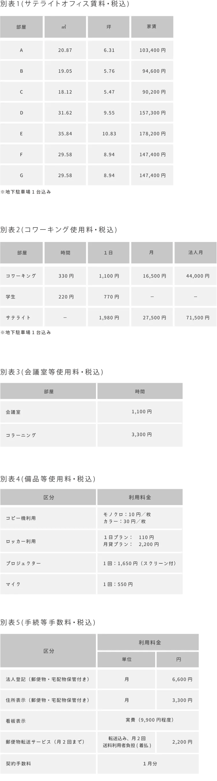 - 1.会員は、対象スペースを利用できる権利を取得する対価として、基本的な利用料金を支払うものとします。利用料金は第2条第1項に規定する会員種別に従い、別表1,2に定める金額とします。その他の基本的な利用料金については別表5に定める金額とします。